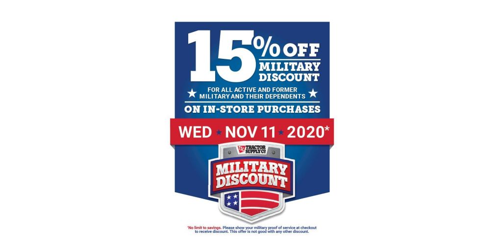 15 off 1 days ago Available only on July 4th Tractor Supply offers a 15 discount to both active duty military personnel as well as veterans. 15 Off Veterans Day. 11 customers with valid military identification or other proof of service will receive the 15 discount on their total purchase.